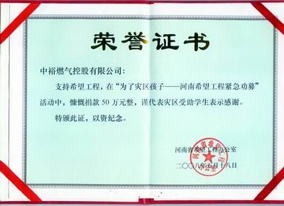 "隨著救援活動(dòng)的進(jìn)一步深入開展,汶川大地震所引發(fā)的慘重災(zāi)情深深地觸動(dòng)了每一位中裕人的靈魂。5月18日,中裕燃?xì)饪毓捎邢薰纠^各子公司自發(fā)組織員工掀起以“奉獻(xiàn)一份愛心,貢獻(xiàn)一份力量”為主題的捐助災(zāi)區(qū)熱潮之后,又于河南省希望工程辦公室發(fā)起的“為了災(zāi)區(qū)孩子——河南希望工程緊急勸募”活動(dòng)中再行義舉,捐出善款50萬元。