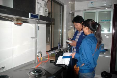 (入戶置換工作現(xiàn)場,工作人員一邊對燃氣管道中余存的煤氣進行放散,一邊使用POS機將IC卡燃氣表中存留的煤氣氣量按價格比率折算為天然氣。)