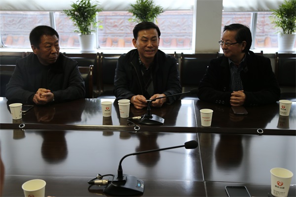 河南省住房和城鄉建設廳城建處副處長范軍付先生(中)、中國建筑學會建筑施工分會王新泉教授(右)、焦作市住房和城鄉建設局副局長李戰勝先生(左)聽取培訓基地建設方案匯報